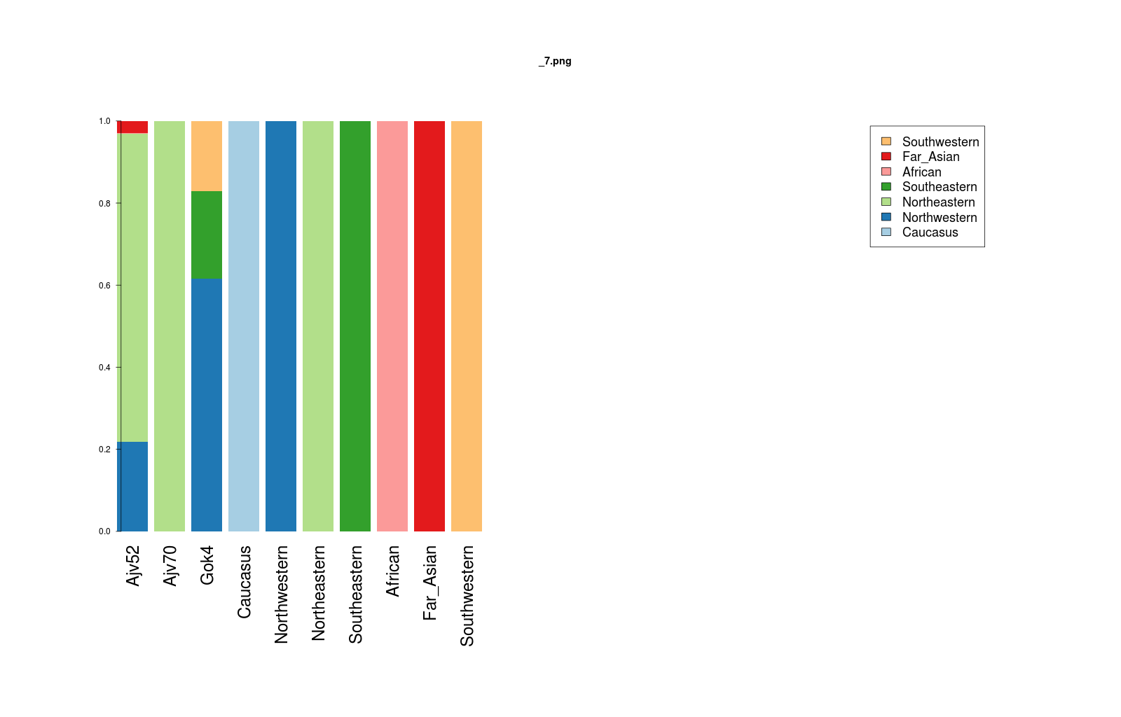 Ajv70 (bare 1) est 100% "Northeastern" ; Ajv52 (barre 2) est 75.1% "Northeastern", 21.8% "Northwestern", 2.9% "Far_Asian",